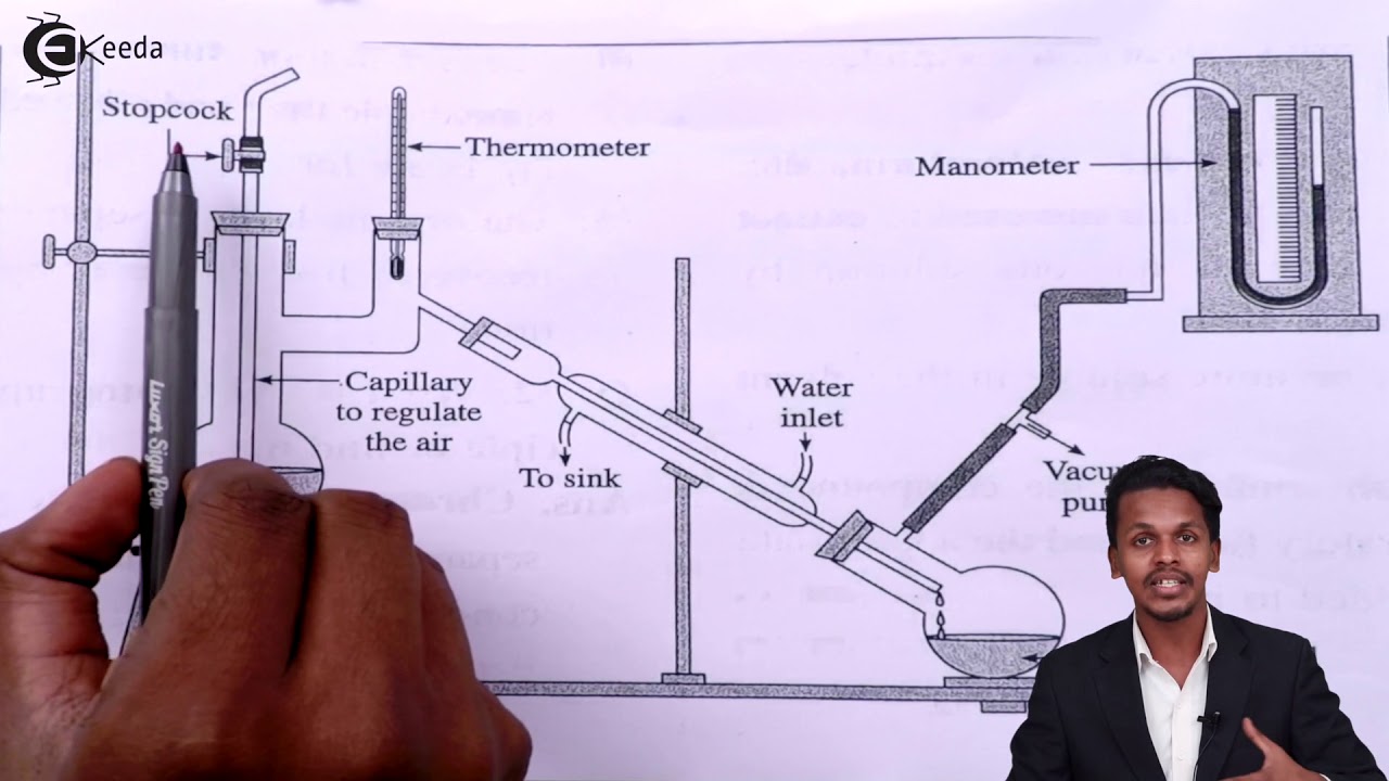 This method is used for the purification of high boiling liquids and liquids which decompose at or below their boiling points. Distillation under reduced pressure is used to purify a liquid that has a habit of decomposing on boiling. The apparatus for distillation is shown.