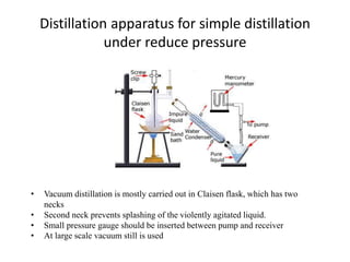 How to Purify by Distillation at Reduced Pressures Vacuum Distillation How it works. Since the boiling points of liquids are depressed at reduced pressure organic compounds can be distilled at lower temperatures. Method of distillation under reduced pressure is used to purify liquids havi Assertion.