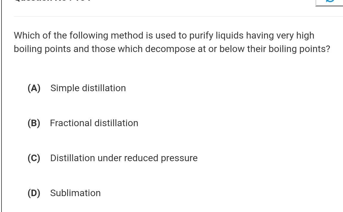 Which Of The Following Method Is Used To Purify Liquids Having Very Highboiling Points And Those Which Decompose At Or Below Their Boiling Points A Simple Distillation B Fractional Distillation C Distillation Under Reduced Pressure D